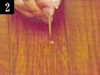 周囲の色に近い色のハードワックスを選び、電気ゴテで溶かし傷の周辺よりより多少盛り上がる程度に充填します。